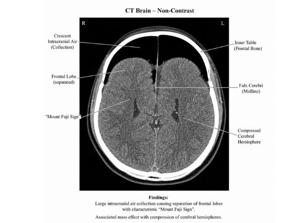 On imaging, the brain’s frontal lobes resemble the silhouette of Japan’s well-known Mount Fuji, appearing crushed and divided by air.