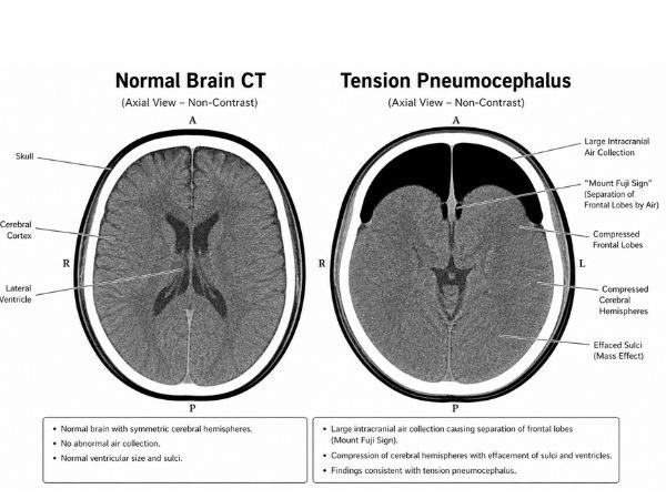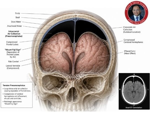 The Mount Fuji Sign in Tension Pneumocephalus is a vital radiological hint that enables medical professionals to promptly diagnose an uncommon but potentially fatal illness. Preventing major consequences requires early CT diagnosis, rapid therapy, and symptom awareness.